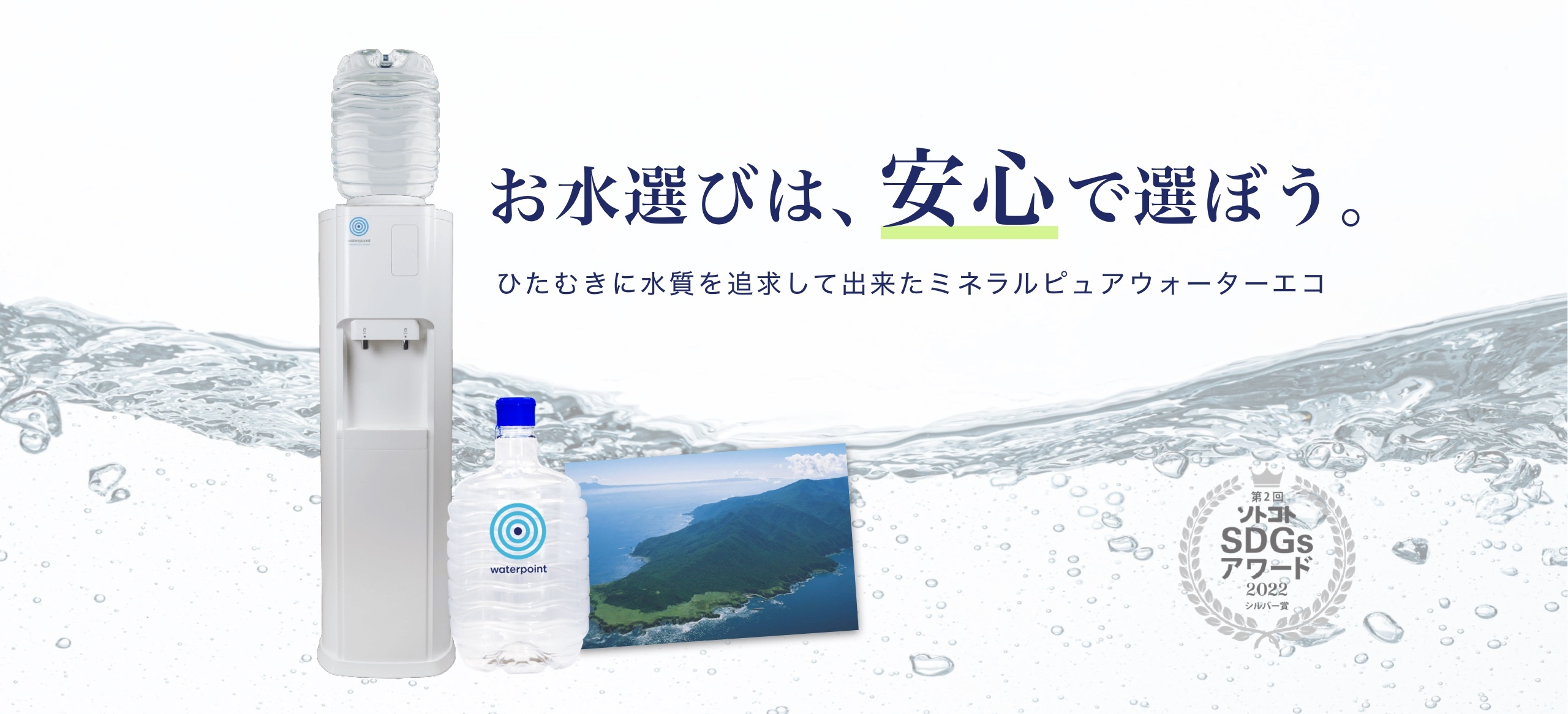「天然水」は地下水等の原水に限られた処理をしたもので、「RO水」は原水に対して逆浸透膜を通したものになります。逆浸透膜は0.1ナノメートル(1,000万分の1ミリメートル)という極めて微細な孔により水分子以外の不純物を除去し、安心安全な純粋水を作り出すことができます。ウォーターポイントは、より綺麗で純度の高いお水を作るため、RO水にさらに独自技術による工程を加えています。
